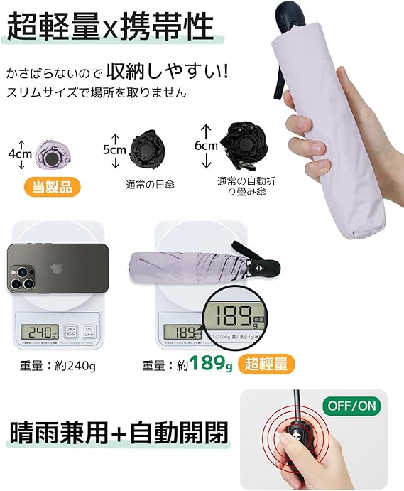 konciwa 日傘 超軽量 189g-199g UVカット率 100% 完全遮光 遮熱 ワンタッチ自動開閉 折りたたみ傘 コンパクト 折り畳み日傘 紫外線遮断 耐風撥水 晴雨兼用 携帯便利 メンズ レディース 母の日 父の日