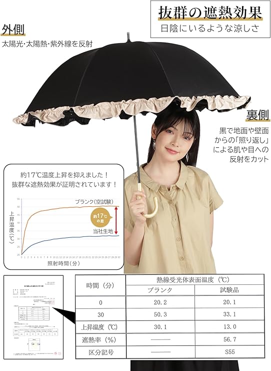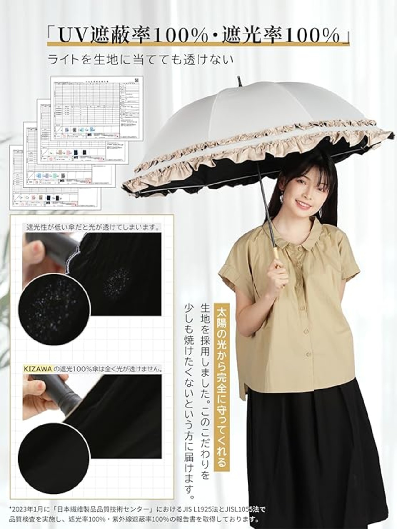 KIZAWA 日傘 uvカット 100 遮光 長傘 深張り 完全遮光 日傘兼用雨傘 レディース 5級撥水 ドーム 軽量 フリル 晴雨兼用 遮熱 かわいい 丈夫 母の日 プレゼント ラタン 持ち手 親骨50cm