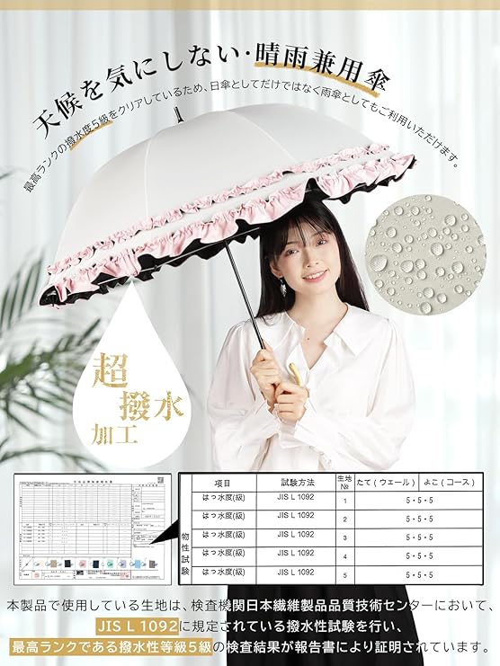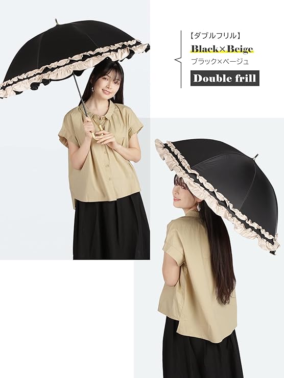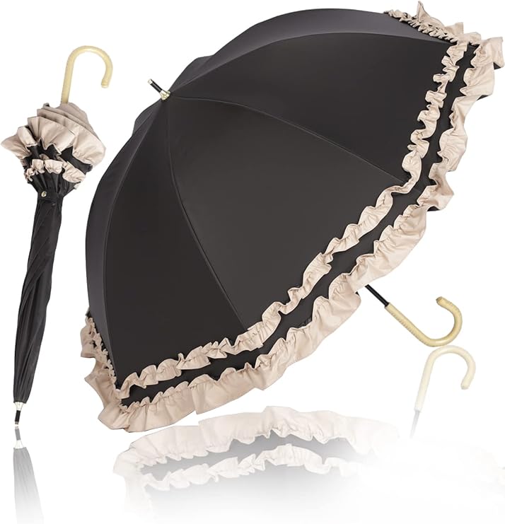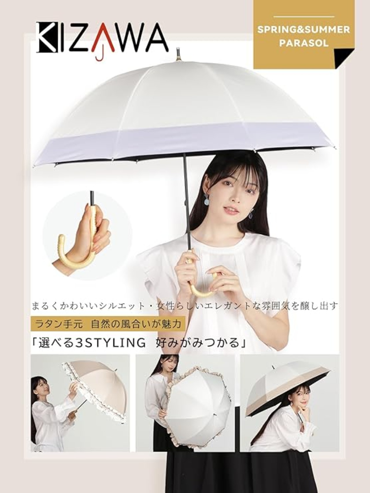 KIZAWA 日傘 uvカット 100 遮光 長傘 深張り 完全遮光 日傘兼用雨傘 レディース 5級撥水 ドーム 軽量 フリル 晴雨兼用 遮熱 かわいい 丈夫 母の日 プレゼント ラタン 持ち手 親骨50cm f