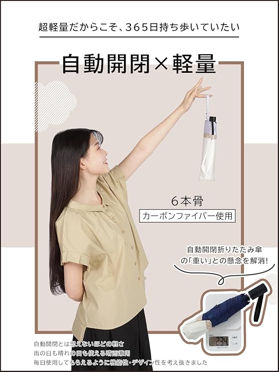 KIZAWA 日傘 超軽量 カーボン傘 ワンタッチ 自動開閉 uvカット 100 遮光 折りたたみ日傘 5級撥水 日傘兼用雨傘 レディース 完全遮光 遮熱 折り畳み日傘 6本骨 親骨53cm e