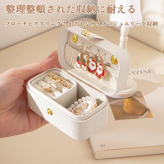 【持ち運びに便利】:寸法9.5*5*5cm、このジュエリーボックスは100gと軽いことがわかります。普段のバッグに入れて持ち運べるだけでなく、旅行のときにスーツケースに入れても場所を取らず、とても便利です。片手サイズで持ち運びやすく、どこへでもお気に入りのジュエリーを持って行けます。