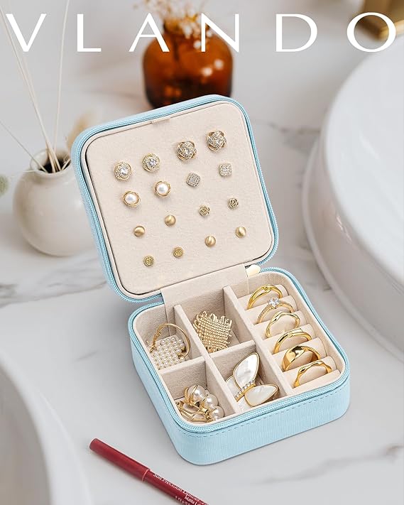 シンプルデザイン - Vlandoのジュエリーストレージボックスはシンプルでコンパクトなデザインを採用し、優雅な外観を持ち、異なるニーズに合わせた2つの取り外し可能な仕切板が付属しています。少なくとも8ペアの耳飾りを収納でき、旅行用の保管に最適です。