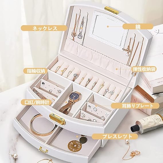 OKUSEKAY ジュエリーボックス ジュエリー収納 アクセサリーケース 女の子 女性 人気 2層 鏡付き 大容量の宝石箱 小物入れ ピアス ネックレス 指輪 イヤリング収納 母の日、クリスマス、結婚式の日、誕生日プレゼント用 (ホワイト) a