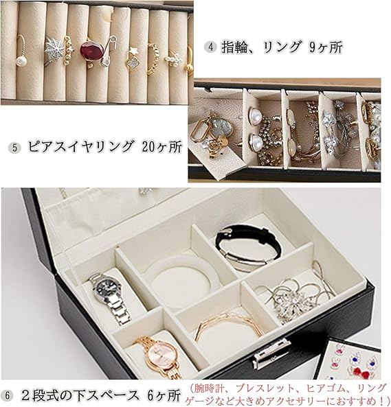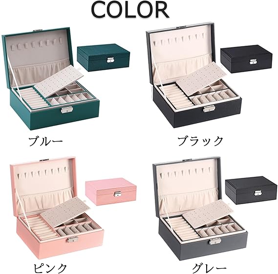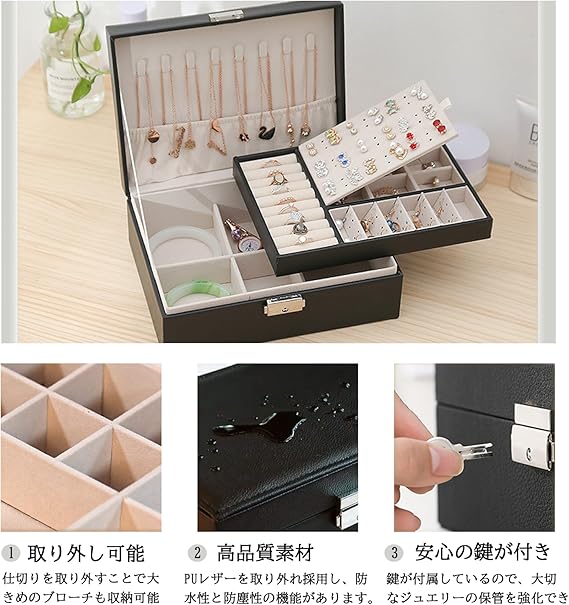 【高品質素材】外側は上質なPUレザーを採用し、高級感とエレガントな雰囲気が溢れています。防水性と防塵性の機能もあります。汚れは濡れタオルの拭き上げだけで、綺麗さを保つことができます。内側は柔らかいベルベットを採用し、大切なジュエリーを傷つ