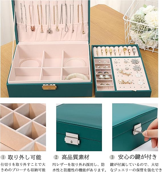 【高品質素材】外側は上質なPUレザーを採用し、高級感とエレガントな雰囲気が溢れています。防水性と防塵性の機能もあります。汚れは濡れタオルの拭き上げだけで、綺麗さを保つことができます。内側は柔らかいベルベットを採用し、大切なジュエリーを傷つ