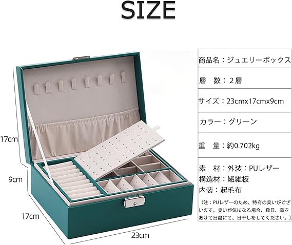 【商品仕様】約サイズ:23cm×17cm×9cm。重さ:約0.702kg 素材:外装:PUレザー、構造材:繊維板、内装:起毛布。カラー:グリーン。注:PUレザーのため、特有の臭いがございます。臭いが気になる場合、数日、蓋をあけて日陰にて、日干しをしてください。
