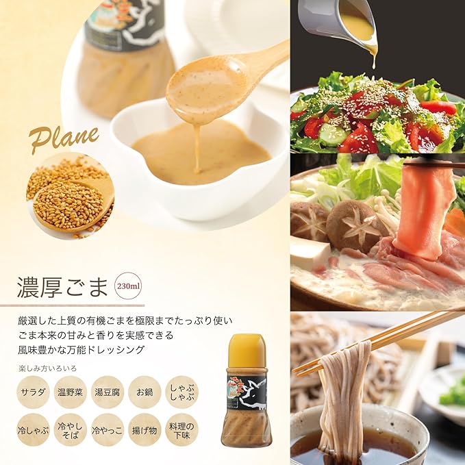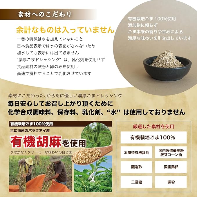 厳選した上質の有機ごまを極限までたっぷり使い、ごま本来が持つ甘みと香りが実感させる風味豊かなドレッシングです。原材料に使用していた本醸造醤油が、本醸造有機醤油になりました。 これによりゴマの濃厚な味わいもありながら、まろやかさも加わり更に、美味しいドレッシングになりました。