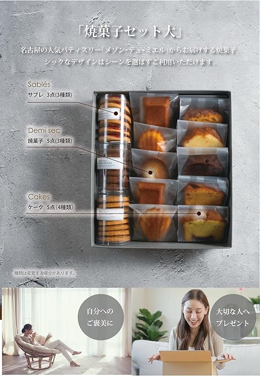 商品サイズ・・・【焼菓子セットL】215mm×190mm×55mm、【焼菓子セットM】145mm×190mm×55mm、