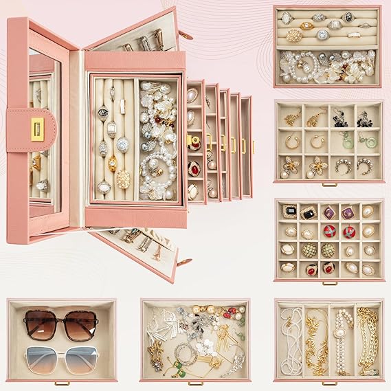 AKOZLIN 大型ジュエリーボックスオーガナイザー 機能的ロック可能 大きな鏡付き レザージュエリー収納ケース レディース ガールズ リング ネックレス イヤリング ブレスレット ホルダー オーガナイザー ピンク a