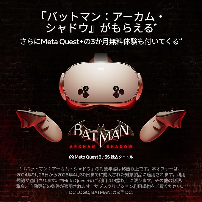 『バットマン:アーカム・シャドウ』とMeta Quest+をもらおう Meta Quest 3Sを購入すると、今なら『バットマン:アーカム・シャドウ』*とMeta Quest+の3か月無料体験** (合計11,400円相当)がもらえる。 *『バットマン: ア