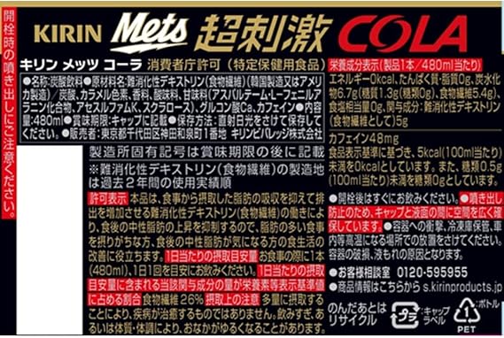 原材料:難消化性デキストリン(食物繊維)(アメリカ製造又は韓国製造)/炭酸、カラメル色素、香料、酸味料、甘味料(アスパルテーム・L-フェニルアラニン化合物、アセスルファムK、スクラロース)、グルコン酸Ca、カフェイン