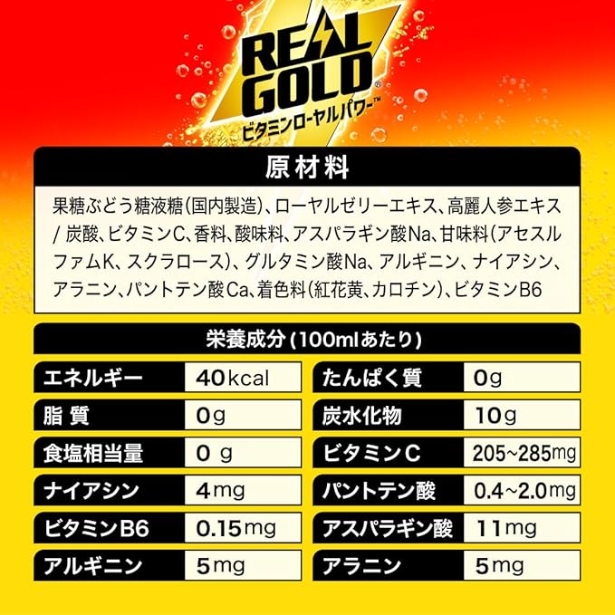 原材料:果糖ぶどう糖液糖(国内製造)、ローヤルゼリーエキス、高麗人参エキス/ 炭酸、ビタミンC、香料、酸味料、アスパラギン酸Na、甘味料(アセスルファムK、スクラロース)、グルタミン酸Na、アルギニン、ナイアシン、アラニン、パントテン酸Ca、着色料(紅花黄、カロチン)、ビタミンB6