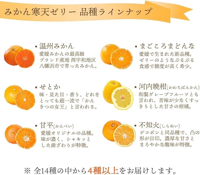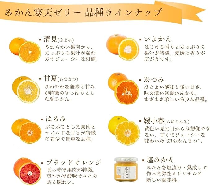 愛媛県八幡浜市産のかんきつを食べ比べできるみかん寒天ゼリーのセットです。