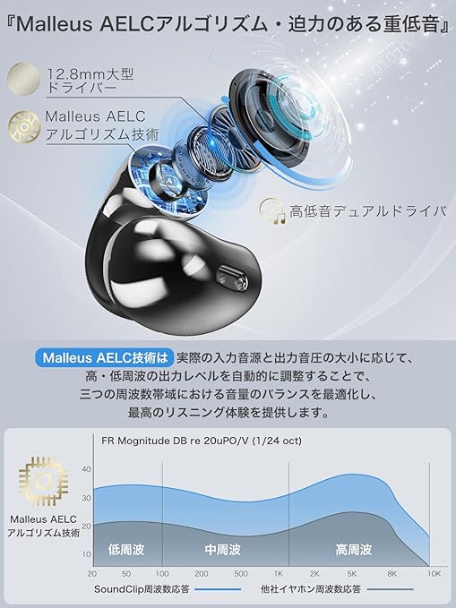 【アクセ感覚のOWSイヤホン・新たな自由な感覚】Earaku(イアラク)の「SoundClip」はアクセサリー感覚で装着できるイヤカフ型のワイヤレスイヤホンです。イヤーカフ型のイヤホンだから、アクセサリー感覚で耳の軟骨を挟むだけで、耳の穴を塞がずに音楽を楽しめます。外部の音も完全には遮断されないので、車のクラクションやアナウンスなど、周囲の音も自然に聞き取れるため、安心して使用できます。音楽を聴きながら家事をしていても、家族とのコミュニケーションがスムーズに取れるので便利です。