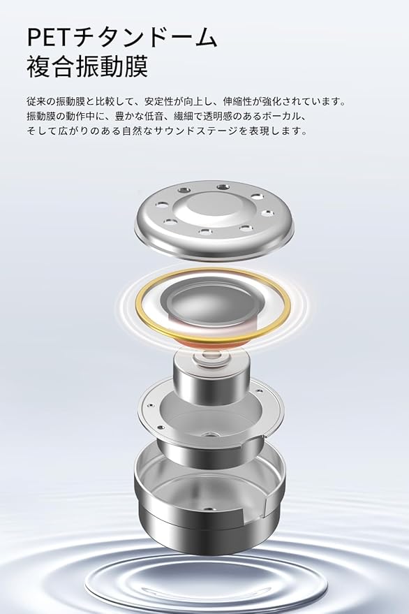 【HIFIサウンド】TANCHJIMが独自開発した高性能デュアルチャンバーシングルダイナミックドライバーユニットは、94dB時の高調波歪み率を<0.05%に抑え、中低音域のコントロールと音のディテールを最大限に向上させます。PETチタンドーム複合振動膜と迷路型音響構造設計により、低音はさらに深みがあり力強く、伸びやかさが向上しています。さらにボーカルは繊細なニュアンスまでクリアに表現する高音質を実現しています。