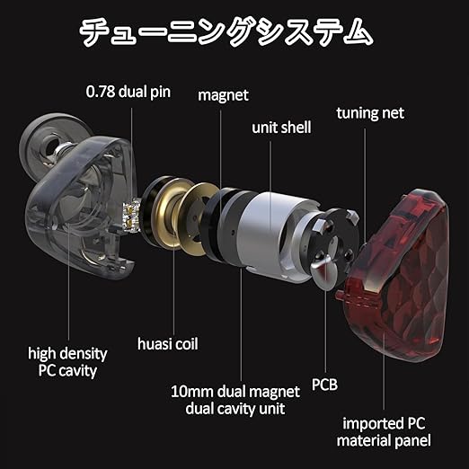 HiFiイヤホン仕様-10mmデュアルマグネット&デュアルチャンバー:強力な磁気回路と二重音響構造で、深みのある低音とクリアな高音を再現。低インピーダンス(16Ω):スマホやタブレットでも高音質再生可能。アンプなしで手軽に使用可能。PU+PEEK複合振動膜:ポリウレタンの柔軟性とPEEK樹脂の剛性を融合。微細な音のニュアンスまで忠実に再生。