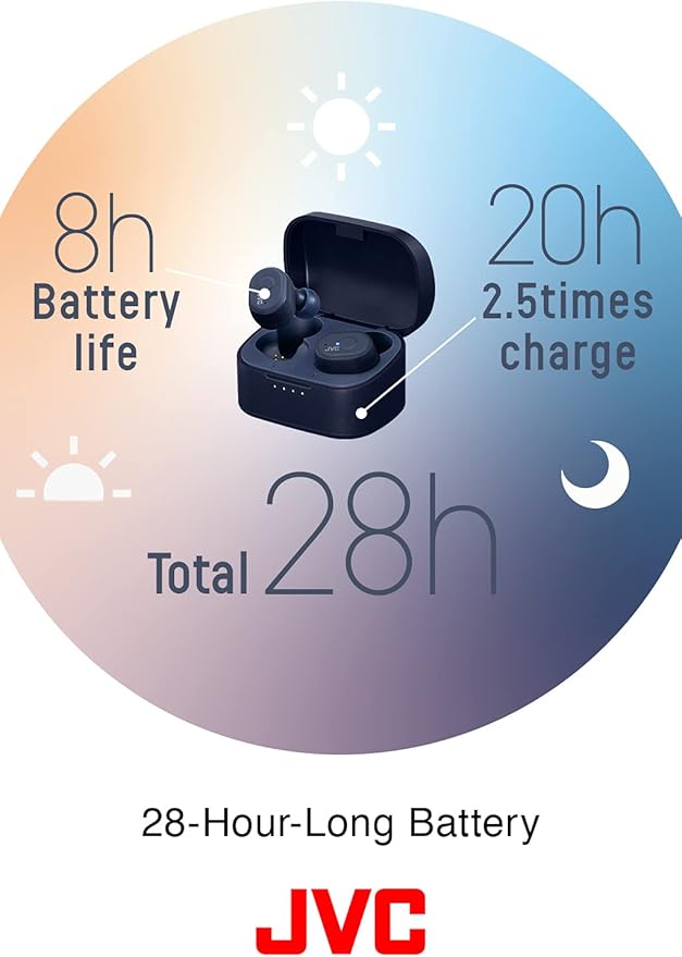 本体のみで約8時間の連続再生と、充電ケースでのフル充電(約8時間×2.5回)により合計約28時間の長時間再生が可能。また、10分の充電で約1時間の連続再生が可能なクイック充電にも対応。使用条件により変わります。