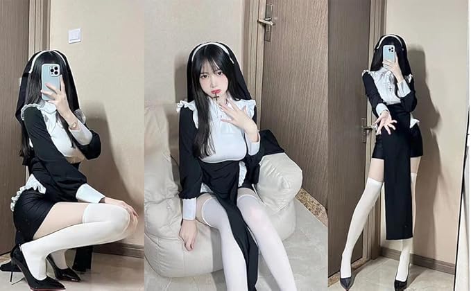 [ChicFlow] 修道女コスプレ衣装 シスター服 ハロウィン 仮装 レディース 十字架付き 演出服 (7点セット)