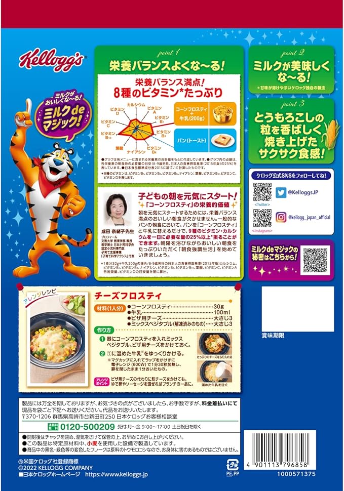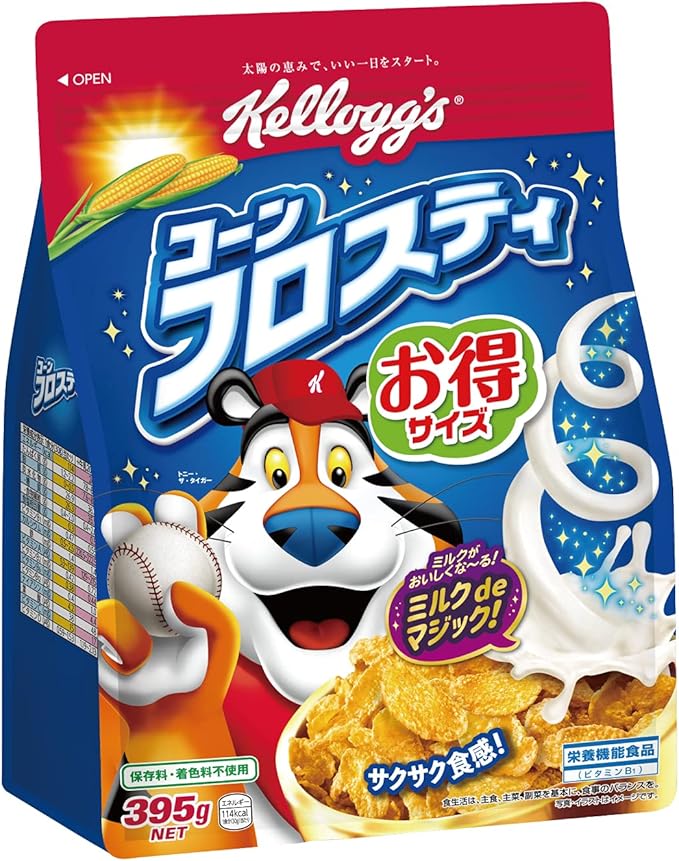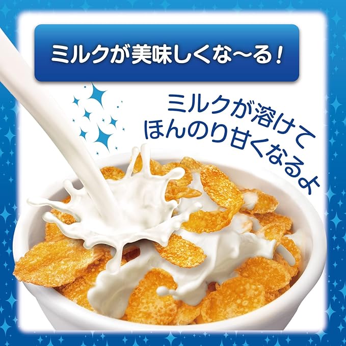 原材料:コーングリッツ(非遺伝子組換え)、砂糖、麦芽エキス、食塩、ぶどう糖果糖液糖 / ビタミンC、ナイアシン、鉄、酸化防止剤(ビタミンE)、乳化剤(大豆由来)、ビタミンB1、ビタミンB2、ビタミンB6、酸味料、ビタミンA、葉酸、ビタミンD、ビタミンB12