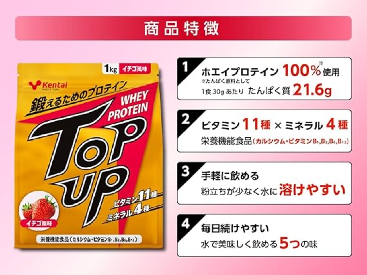 Kentai ケンタイ TOP UP ホエイプロテイン イチゴ 1kg【ビタミン11種 × ミネラル4種】栄養機能食品 国内製造 WPC ホエイ プロテイン whey protein ストロベリー a
