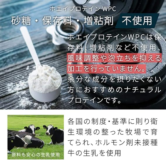 よりピュアなたんぱく質を求めて。余計な成分の入っていない、プロ仕様のWPCホエイプロテインです。甘味料や香料で飲みやすさは追求せずに、たんぱく質をしっかり摂りたいストイックな方、ナチュラル志向な方に向けたWPCホエイプロテインです。もちろんアナタのアイデア次第で美味しく、飲みやすくアレンジで