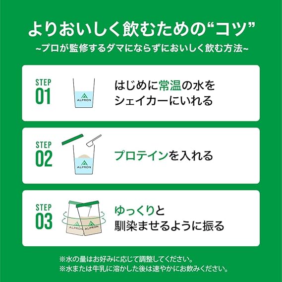 【お召し上がり方】プロテインシェイカーを使用して、水または牛乳200ml~300ml(おすすめは250ml)に付属のスプーン2杯(約30g)を溶かしてください。