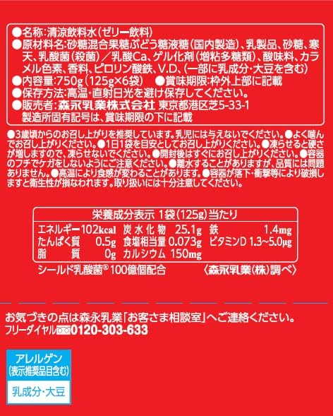 原材料:砂糖混合果糖ぶどう糖液糖(国内製造)、乳製品、砂糖、寒天、乳酸菌(殺菌)/乳酸Ca、ゲル化剤(増粘多糖類)、酸味料、カラメル色素、香料、ピロリン酸鉄、V.D、(一部に乳成分・大豆を含む)