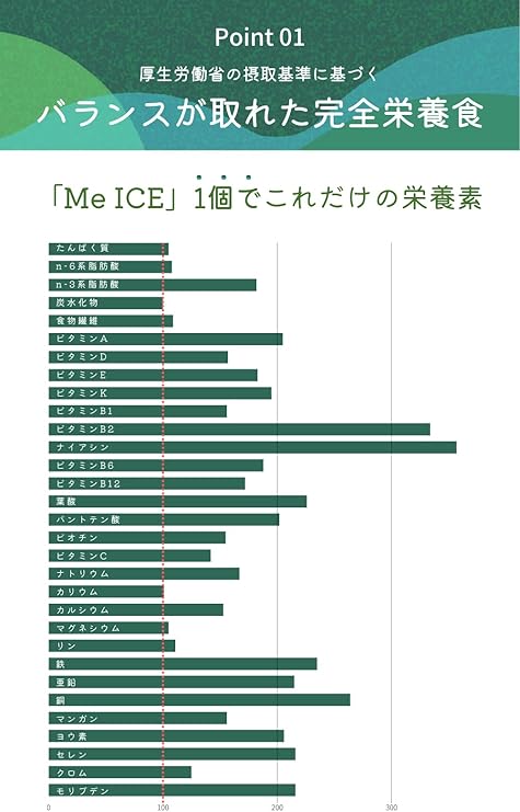 【完全栄養食のアイスクリーム】1個で日常に必要な栄養素33種類をバランス良くとれる完全栄養食のアイスクリーム ※1個で、栄養素等表示基準値に基づき、1kcalあたりで33種類全ての目標栄養値を充足する。
