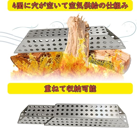 燃焼効率upメタル薪! 焚き火の薪に加えるだけで空気の通り道を確保でき、下方から空気を送り込み、スピーディーな着火と焚き火の燃焼効率をサポートできます。お手持ちグリルの火力が弱いとお悩みの方に。複数のロストルを部分的に重ねることができ、火床サイズを選びません。