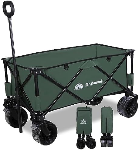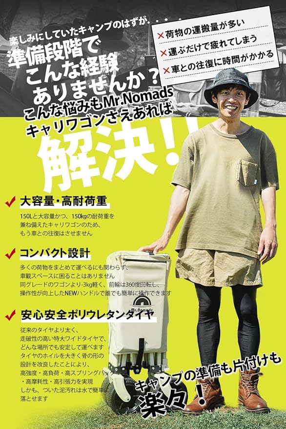MR. NOMADS 【ラグビー日本代表使用】 キャリーワゴン キャリーカート 4輪 こども乗せれる 折り畳み 軽量 大容量 150L コンパクト 大きいタイヤ 頑丈 耐荷重150kg 自立収納 ワンタッチ収束式 アウトドアワゴン キャンプ ワゴン カート 子供 (KW001 Olive) a