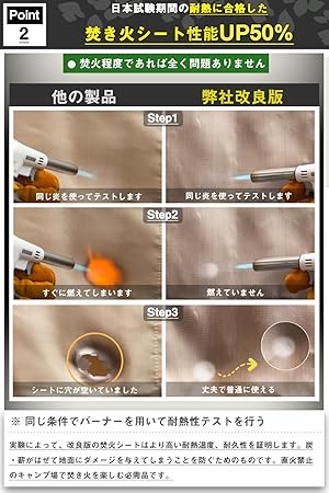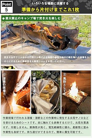 【地面を守る】使用寸法:90×60cm;2023改良モデル(超高耐熱焚き火シート)は誕生!2022年12月1日に開発されました。改良版の本焚き火シートの縫い目部分にすべて専用の防火線を採用します。耐熱性も他のメーカーのものより50%も向上しています。折りたたみや運搬が非常に簡単です。この焚き火シートを焚き火台の下に敷いて、焚き火やBBQをする時に起こってしまいがちな、炭・薪がはぜて地面にダメージを与えてしまうことを防ぐためのものです。非常にアウトドアやキャンプに適しています。直火禁止のキャンプ場