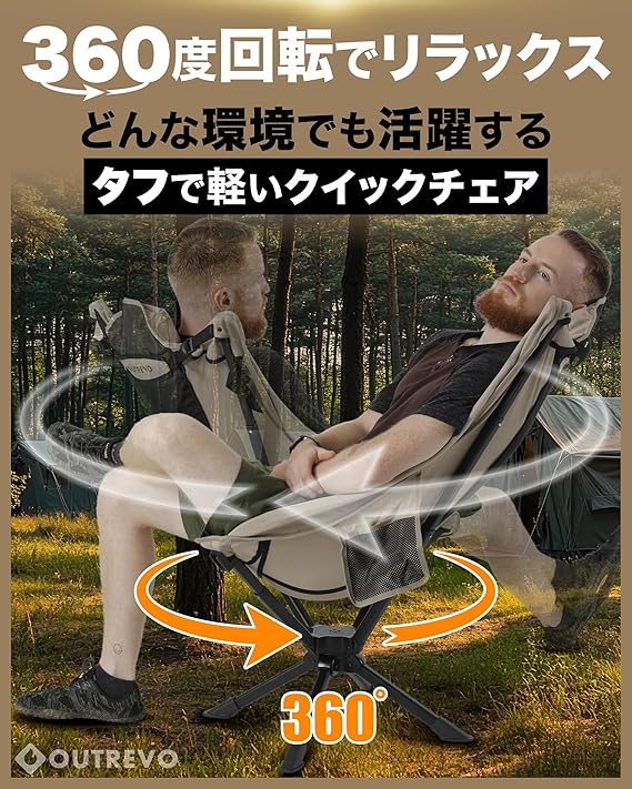 【360度回転 】【ハイバック、ヘッドレスト付きで首までリラックス♪】どんな環境でも活躍するタフで軽い、クイック アウトドアチェア。ハイバック(背もたれ、ヘッドレスト付き)。スマホなどが収納できる便利な小物入れ、シリコンカップホルダーが付属。ワンタッチ 折りたたみ式。軽量 コンパクト、わずか2.65kg