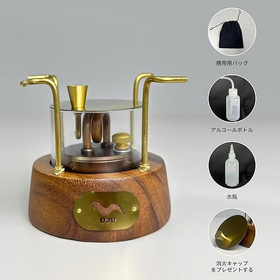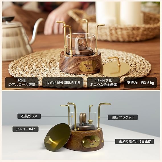 デザイン: 高級感のある木製ベースと真鍮製パーツを組み合わせたファッション的なアルコールバーナー