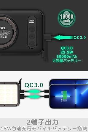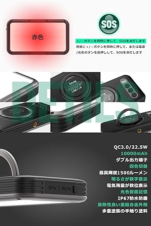 【10000mAh/3.7V QC3. 0/22.5W】USB充電式アウトドアledキャンピングライト。QC3.0スマートチップを搭載し、最大出力22.5Wで、アウトドアや緊急時にスマートフォンの充電を迅速に行える。