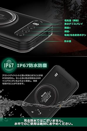 【デジタル表示輝度/電力量】輝度表示は0~100、電力量表示は0%~100。屋外キャンプ用にライト