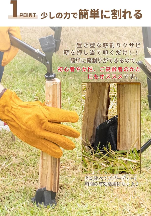 【 新世代の薪割りクサビ 】薪を自分でつくる場合、人力なら薪割り斧、電動なら電動薪割り機を使うのがポピュラーだが、今回、第三の方法として「新世代の薪割りクサビ」が登場しました。薪割りを楽しいアクティビティにグレードアップする画期的なアイテムです。斧や鉈、ナタなどよりも、力をさほど入れなくとも薪が割れますので、より安心安全、女性やお子様、高齢者も楽しんで薪割りができます。