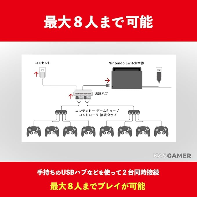 【Nintendo Switch対応】K&SGAMERの接続タップを使うことでスイッチのゲームをGCコントローラで遊べるようになります。
