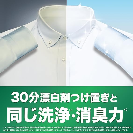 30分漂白剤つけ置きと同じ洗浄・消臭力*(*2023年11月時点の市場No.1酸素系液体漂白剤で30分のぬるま湯