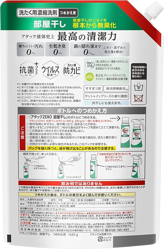 【大容量】 アタックZERO 洗濯洗剤 液体 部屋干しのニオイを根本から無臭化 部屋干し 詰め替え1620g a