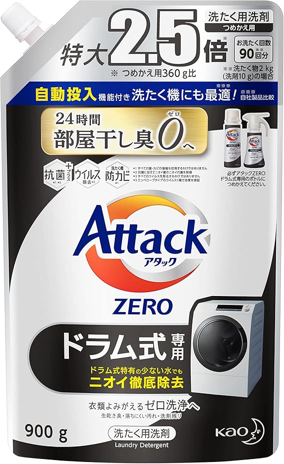 アタック 【大容量】 ゼロ(ZERO) 洗濯洗剤(Laundry Detergent)ドラム式専用 くすみ・黒ずみを防ぐ 詰め替え 900g (清潔実感! 洗うたび白さよみがえる) a
