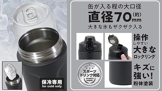 品名:ステンレス製携帯用まほうびん、実容量:1.2L、保冷効力:9度以下(6時間)、素材・材質:内びん/ステンレス鋼、胴部/ステンレス鋼(ポリエステル粉体塗装)、ふた栓・キャップ/ポリプロピレン(耐熱温度100度・耐冷温度-20度)、開閉ボタン・リング/ABS樹脂(耐熱温度80度・耐冷温度-20度)、パッキン/シリコーンゴム(耐熱温度180度・耐冷温度-20度)