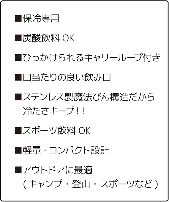 素材・材質:内びん:ステンレス鋼 / 胴部:ステンレス鋼(アクリル樹脂塗装)/ フタ・せん本体:ポリプロピレン / フタパッキン・せんパッキン:シリコーンゴム / カタ・ループ:ポリプロピレン・ポリアセタール