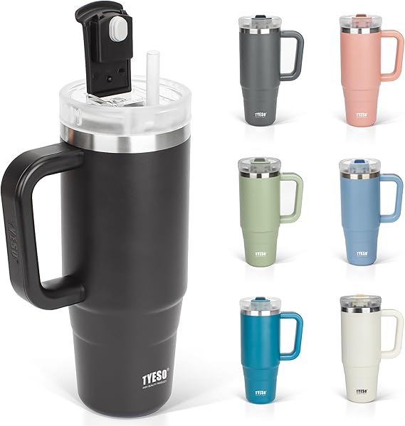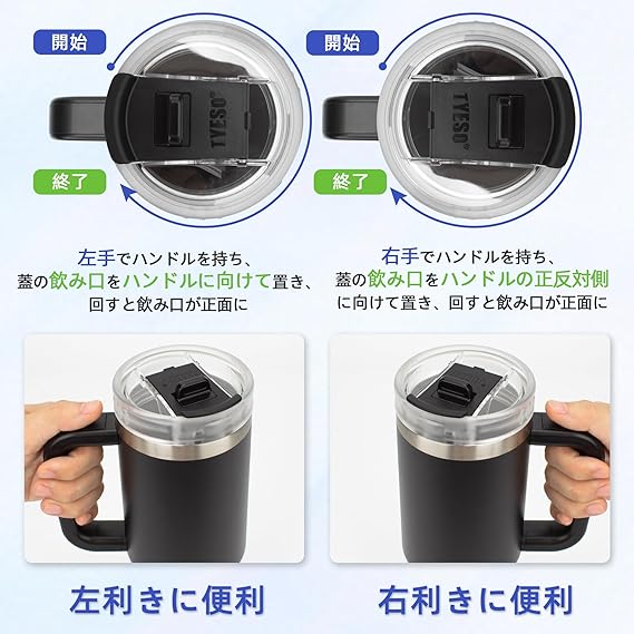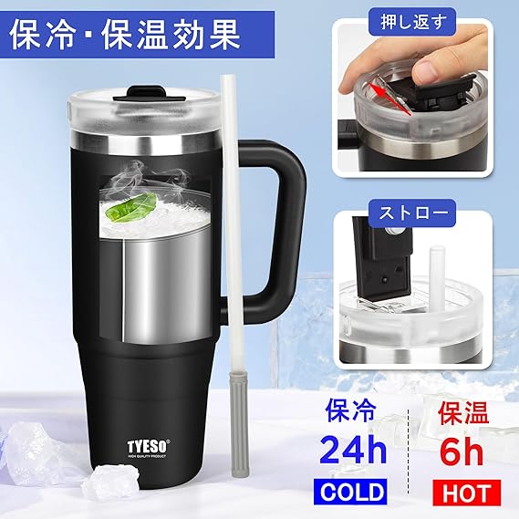 TYESO タンブラー 0.9L 水筒 保冷 ステンレスボトル ウォーターボトル ストロー 取っ手付き ジョッキ アウトドア 真空断熱 二重構造 広口 大容量 直飲 女の子 男の子 900ml ブラック a