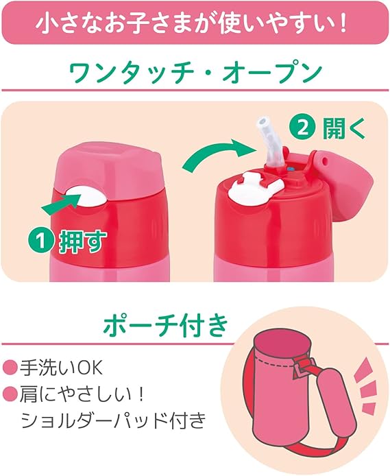 水分補給に便利、軽量コンパクトタイプのストローボトル。子供の肩に優しいショルダーパッド付きポーチ