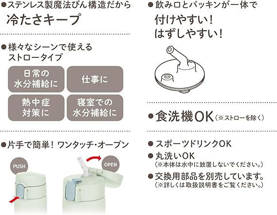 素材:内びん:ステンレス鋼 / 胴部:ステンレス鋼(アクリル樹脂塗装)/ フタ・キャップ本体:ポリプロピレン / 飲み口:シリコーンゴム / ストロー:ポリエチレン
