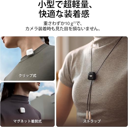 【小さくてもパワフル】 - DJI Mic Miniトランスミッターは、小型で重さわずか10 gの超軽量です[1]。快適に装着でき、目立たないデザインで、マイクを付けていても外観を損ねません。