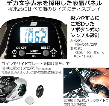 デジタルラインカウンター搭載 / 搭載使用電池:型番CR2032(交換可能) / 船べりアラーム機能 / LEDバックライト付きデカ文字カウンター