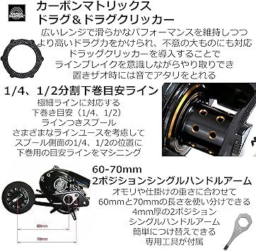 最大ライン巻取:66cm / 最大ドラグ力:11kg / ラインキャパシティ:PE2号(200m)
