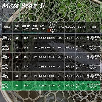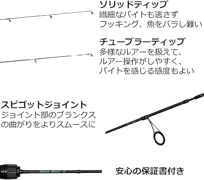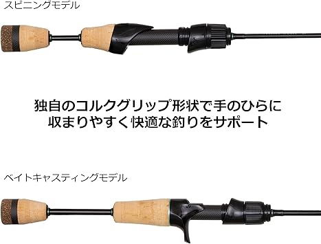 パワーUL●アクションレギュラー●材料カーボン98%,グラス2%●レングス(ft/cm)5’8”/172.7cm●自重(g)65●仕舞寸法(cm)88.4●先径(mm)1.2●ルアー(g)2.0-5.0●ナイロン・フロロカーボンライン(lb)2.5-8.0●ティップチューブラー
