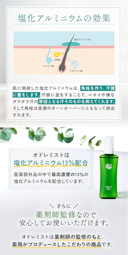 【 オドレミスト本体&詰替え用の2本セット】【 日本製 】クリニック等でも使われる塩化アルミニウムを主成分とした制汗剤です。香りやパウダーで汗のニオイをごまかすのではなく、汗の出口に蓋(フタ)をして汗そのものを出にくくする制汗剤です。 こんな方におすすめワキ汗で汗ジミができてしまうので服選びが大変・周りの人に汗臭いと思われてないか心配・足の汗がひどく靴の中がいつもムレていて臭ってしまう・手汗のせいで学業や仕事の支障が出ている